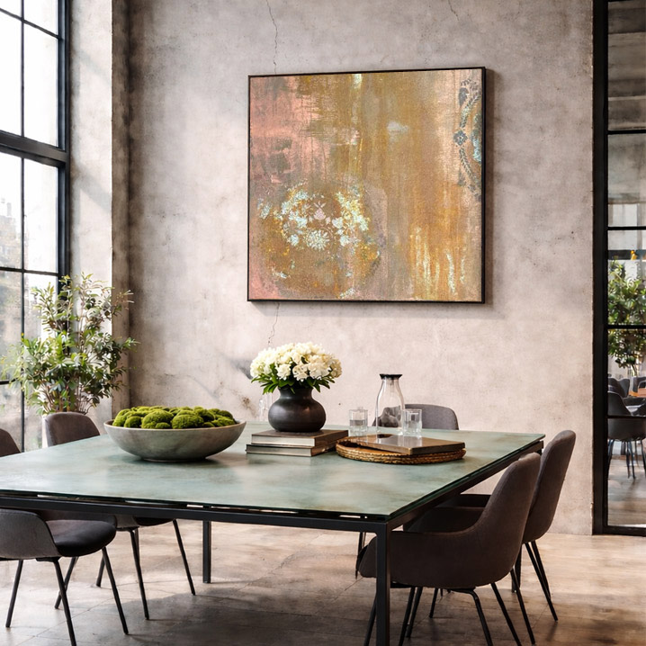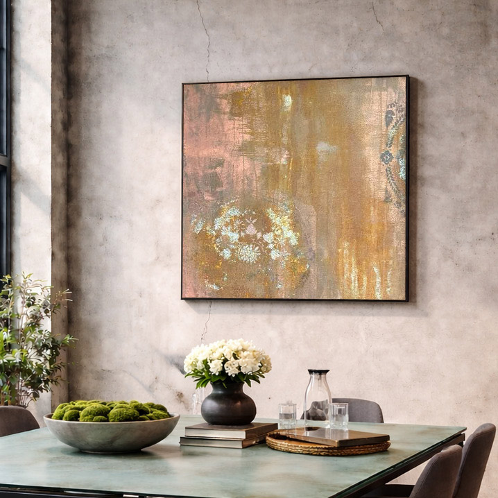 Med sine 93 x 100 cm fungerer værket som et stærkt visuelt fokuspunkt — ideelt til stuen, kontoret, mødelokalet eller entréen. Den mat sorte træramme tilfører en stilren kontrast, der fremhæver de varme oxidtoner og fuldender helhedsindtrykket.