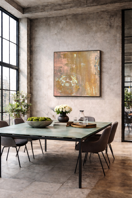 Skab en markant og stemningsfuld atmosfære i dit rum med Patina of Time — et originalt, håndmalet kunstværk af den danske kunstner K. Stjerna (Kim Stjerna Grundtvig Nielsen). Maleriet kombinerer rå industrielle nuancer af rust, irgrøn og kobber, som giver en levende overflade med dybde, struktur og karakter. Inspirationen fra metallisk patina og tidens spor skaber et moderne udtryk, der passer perfekt til nordiske, industrielle og minimalistiske indretninger.