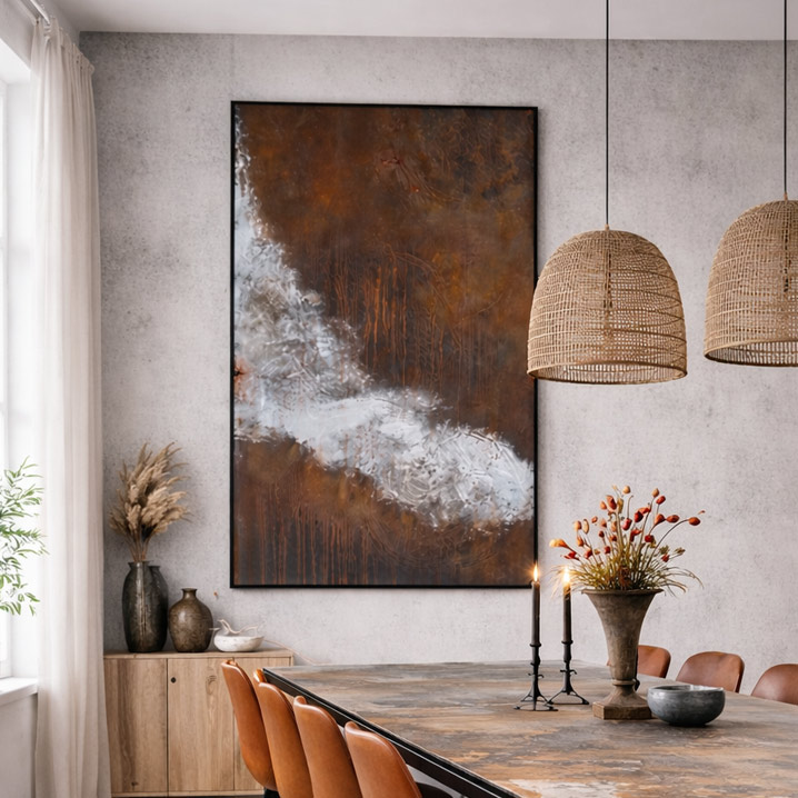 Nøgleord: original kunst, abstrakt maleri, rust farver, sølv toner, moderne vægkunst, dansk kunstner, nordisk design, industriel stil, stor kunst til væg, indretning med kunst.