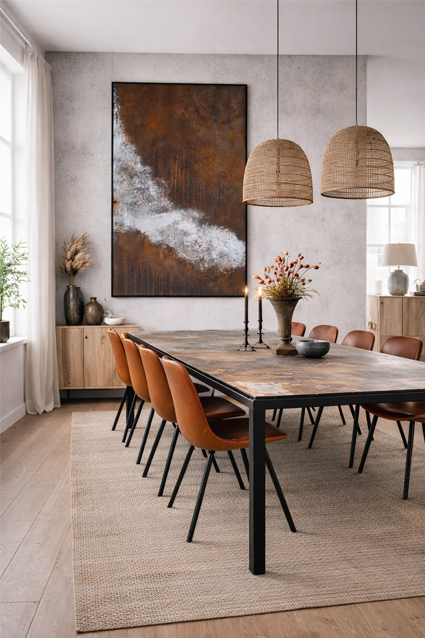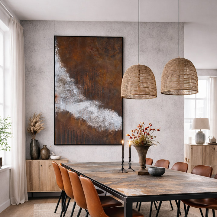 Oxide Edge er skabt til dig, der ønsker moderne kunst med rå overflade, kontrast og ærlig materialitet – et maleri, der gør indtryk og forstærker rummet med industriel poesi.