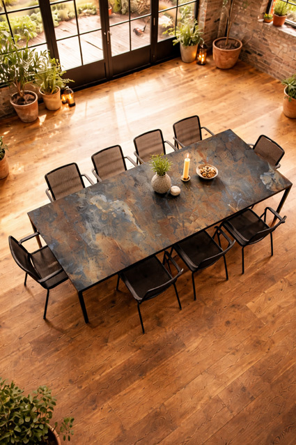 Black Toscana fra RN Design er et eksklusivt havebord i keramik, skabt til dig der ønsker et moderne, råt og vedligeholdelsesvenligt udendørs spisebord. Bordet kombinerer en slidstærk keramisk bordplade med et robust pulverlakeret stålstel – perfekt til terrasse, gårdhave eller udekøkken.