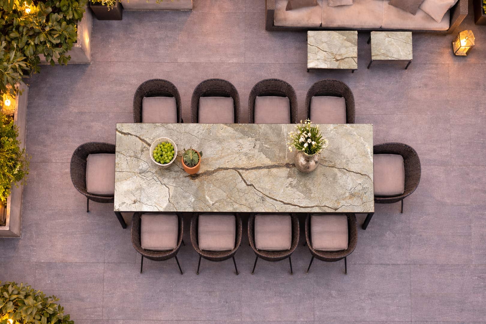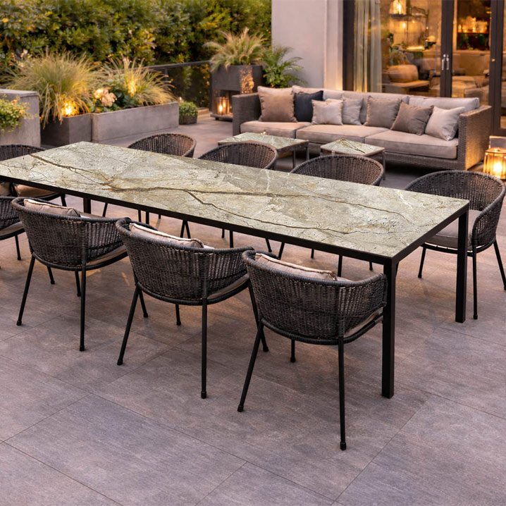 Den lyse keramiske bordplade har et levende naturstensudtryk med varme sandtoner og gyldne årer. Overfladen reflekterer lyset diskret og tilfører terrassen en rolig, eksklusiv karakter.