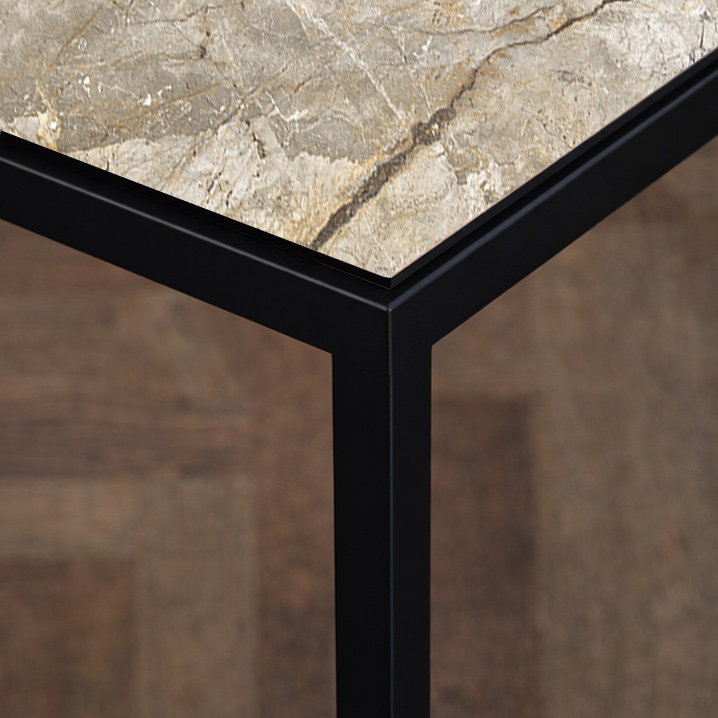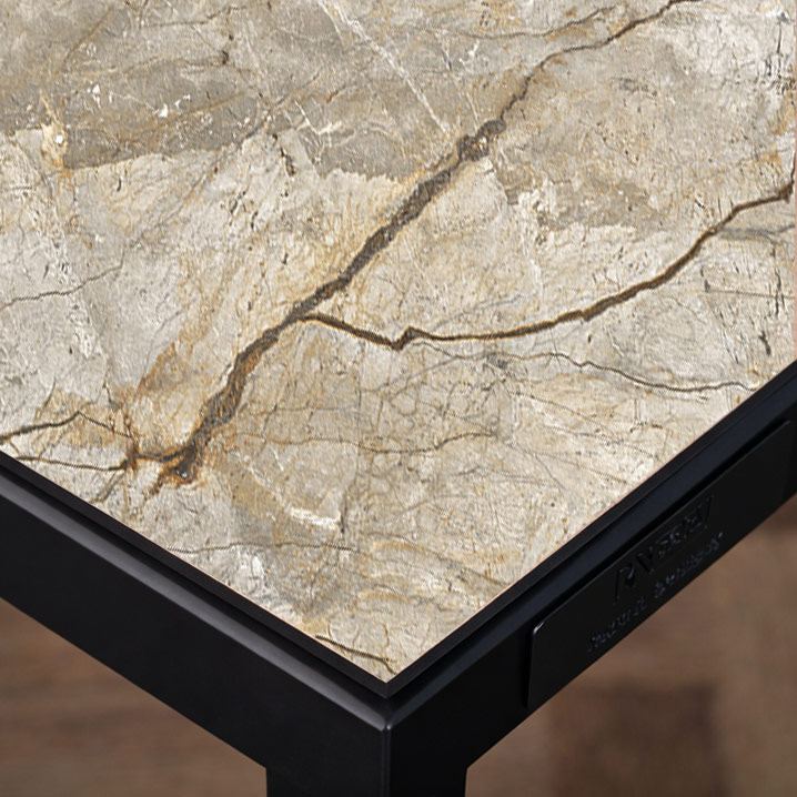 Bordpladen er fremstillet i kompakt keramik – et materiale valgt for sin styrke, stabilitet og æstetiske dybde.