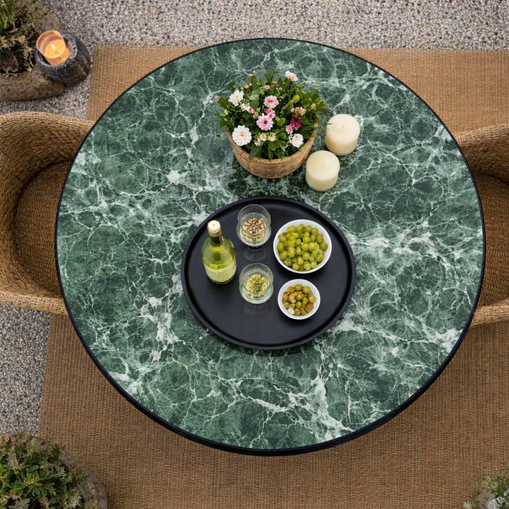 Den dybe grønne stenstruktur giver bordet et naturligt og eksklusivt look, som passer perfekt ind i både moderne nordiske hjem, terrasser og haver.