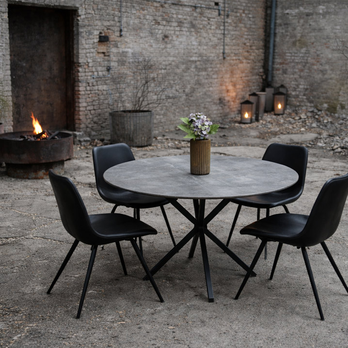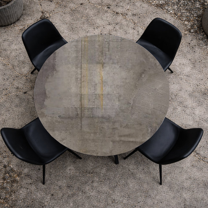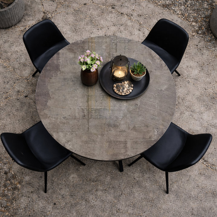 Black Bronx fra RN Design er et eksklusivt rundt havebord, hvor rå materialer møder et stilrent, nordisk udtryk. Kombinationen af en karakterfuld keramisk bordplade og et elegant sort stålstel giver bordet en stærk visuel identitet – perfekt til moderne uderum.