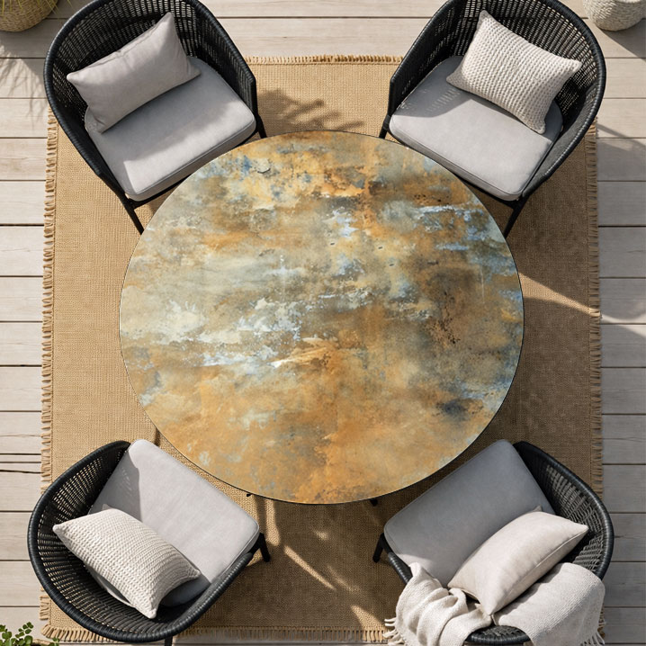 Den keramiske overflade er inspireret af naturlige sten- og patinaeffekter, hvilket giver hver bordplade sit eget udtryk.